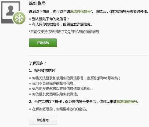 4、及时冻结账号 如果确认自己或好友的手机丢失、微信号被盗等涉及到支付安全的情况,可及时登陆http://110. qq.com,对微信号进行冻结,不法分子就无任何可乘之机了! 5、微信的赔付机制 上面我们说的都是预防机制,如果真的出现支付上的安全问题,微信对此也推出了赔付机制。