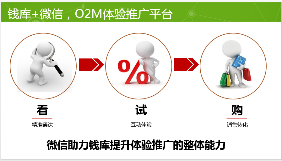 1. 以微信为代表的移动互联网应用的不断成熟,会改良和升级传统体验营销解决方案。传统做法下,品牌开展体验营销面临实施成本高、技术难度大、管理较复杂等难题,通过微信提供的“看(精准通达)、试(互动体验)、购(销售转化)”能力,钱库提升了体验营销解决方案的整体能力,让信息传递更高效,让试用体验更完整,让销售转化更流畅。