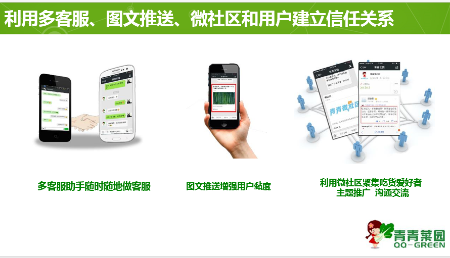 2. 青青菜园微信号就是我们的事业,为此我们从运营定位、自定义菜单、界面风格和商务流程上,都花了更多心思:①从用户选菜到微信支付完成全流程只需要4个步骤,满足用户方便、健康和精致的需求,并以此形成口碑效应;② 利用微信接口,我们自主开发了自己的微信下单系统;③ 界面风格简约,下单跟踪系统显示帐号的鲜活,微社区则增强了用户的黏性。