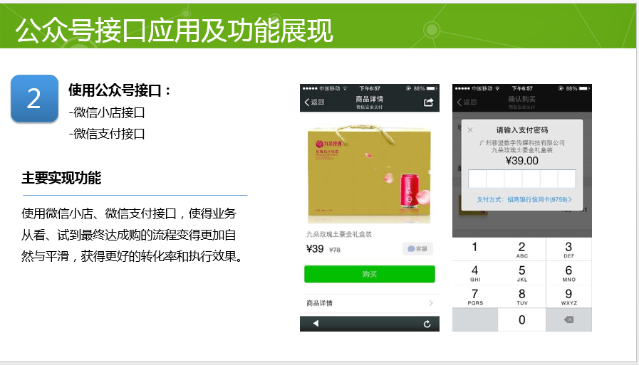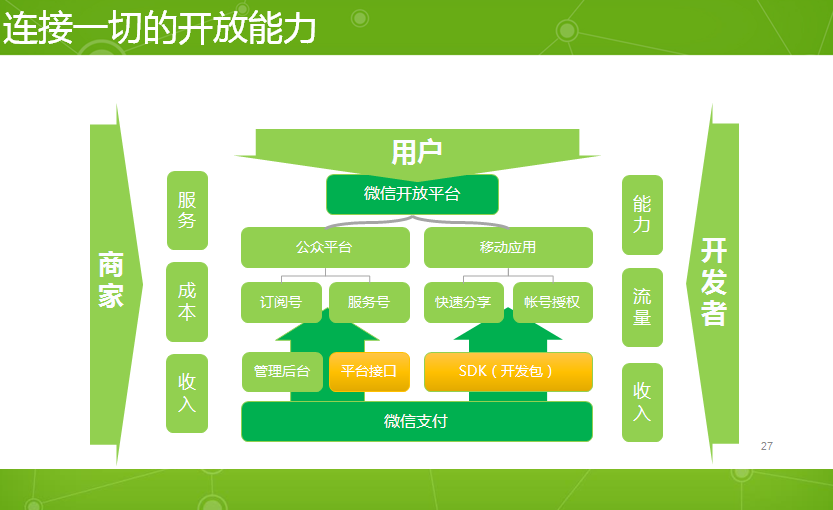 1. 开放不是一种态度,而是一种能力。微信团队分层次、有步骤将开放落到实处:移动应用开放、公众平台开放和微信支付开放。①目前微信已拥有67000多个应用,每天都有数千计应用在接入,这些应用通过微信分享、微信收藏、微信登录和微信支付实现信息流转和销售转化;②目前微信公众帐号有580万,日增长达到1.5万,通过自定义菜单、高级接口、模板消息和微信支付,帮助客户打通全链条;③ 微信支付帮助企业实现O2O商业化闭环,也将帮助更多线下企业打通微信支付。