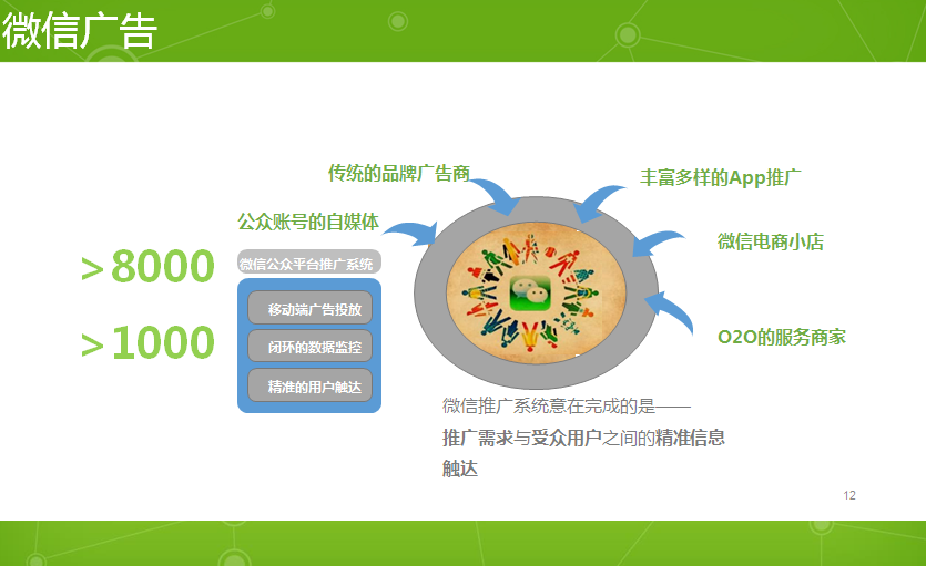 ④ 微信广告:实现推广需求与受众用户之间的精准信息触达,目前内测阶段已有8000个广告主,流量主近1000;