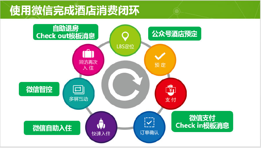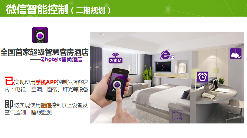 4. 未来,我们希望通过微信为酒店业加入更多智能元素,实现微信一体化入住。入住前,用户扫描房价牌二维码,微信支付入住;入住中,通过微信实现空调、电视等个性化设置;入住后,通过微信一键自助退房。