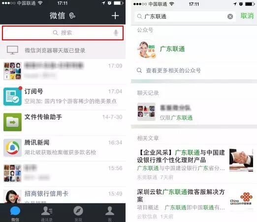 还在冥思苦想上周看到的一篇精彩文章,到底来自于那个公众号?你OUT啦!现在,通过微信进行搜索时,除了能够搜索联系人和聊天记录,还可以搜索公众号、公众号文章、收藏、微信功能,多样化信息一站式呈现,总有一项满足你。