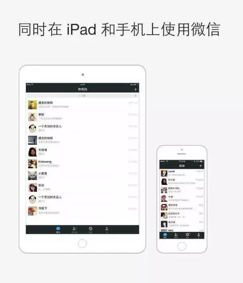 如今,iPad用户在App Store里可以直接搜到微信,安装后的界面也不再有黑边,更令人惊喜的是,现在用户可以同时在iPad上和手机上使用微信,消息也实现了同步收发。