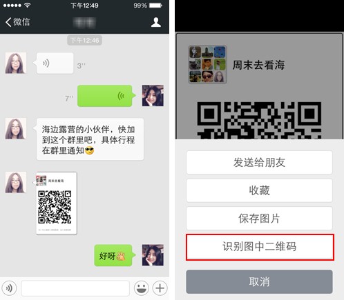 上期,微信邦网小编教了大家如何扫描自己手机中的二维码,现在有更好地办法啦!微信5.4版本中,大家收到好友发来的包含二维码的图片,可于查看图片时长按图片,并在接下来弹出的菜单选项中选择“识别图中的二维码”即可。无需再经历保存图片、重新选取扫描等复杂的操作。