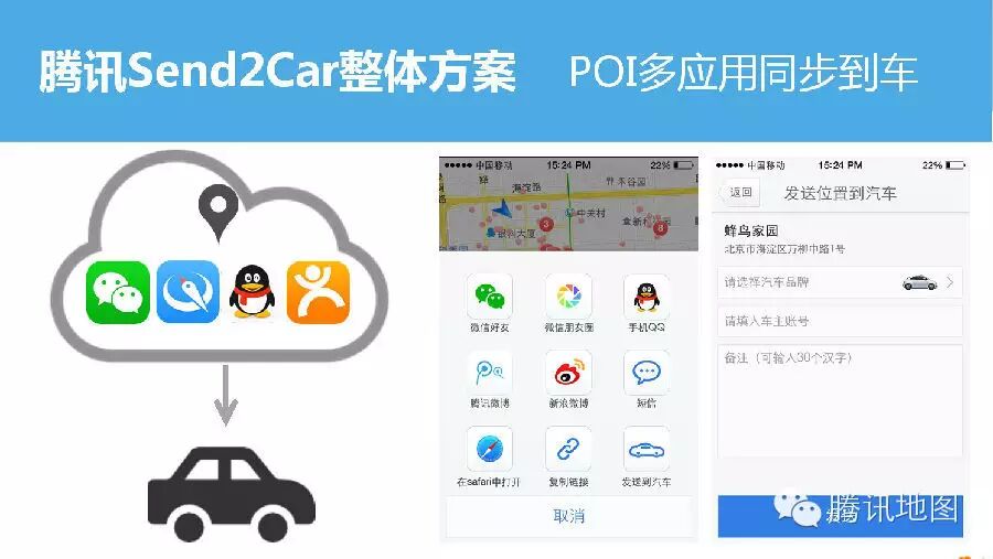 移动互联网时代,生活服务决策或出行服务决策往往是多终端上进行的,有可能在PC上决策,手机上决策,车机上决策等。腾讯send2Car方案可以在PC和手机的各种应用(微信、QQ、地图、大众点评)中,将生活服务决策结果或出行服务决策结果直接发送到车,方便车主出行。这也是国内首发车载版大众点评,该版本充分考虑了用户在驾车环境下的决策需求,用户可以通过语音搜索的方式,方便的寻找周围的KTV、餐厅,也可以决定去哪里看电影或者健身。