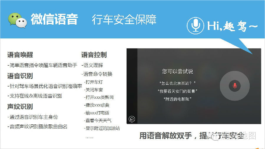 众所周知,腾讯的产品导向文化和创新能力,是腾讯的产品源源不断向前的动力。趣驾团队则将腾讯的创新能力与产品结合的更加完美。在车主的驾车场景中,保证安全性是第一原则,其次才是更丰富的驾驶帮助、娱乐、生活、社交支持。趣驾WeDrive充分考虑到驾车场景的安全性要素,简单语音指令唤醒行车助手,通过语音识别车主,可以实现全程支持语音唤醒、语音识别及语音控制。以口耳交互操作为主,用语音解放双手,帮助车主把注意力集中在方向盘上,为车主的驾车安全保驾护航。 此外,四维图新在趣驾WeDrive中提供了趣驾T服务和趣驾导航。趣驾T服务可以为车主提供含港澳台在内的停车场和加油站动态深度信息以及4S店维修保养、违章限行等详细信息;趣驾导航可支持语音识别、手势识别、真三维地图和360度腾讯街景地图,完美提升车主的驾驶体验。