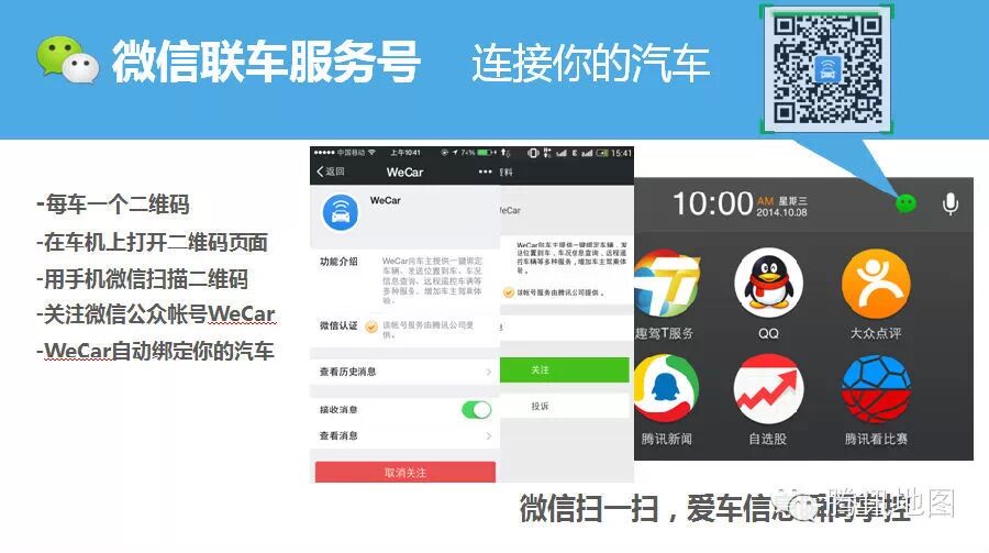 关注微信联车服务号,掌握爱车信息实现远程控制 通过微信远程操控汽车是趣驾的第二个核心亮点。微信联车公众服务账号WeCar的推出,使每辆汽车都可以集成自己独有的二维码,车主只要扫描微信二维码并关注WeCar之后,即可轻松实现车况查询(里程、油耗、胎压等)、远程控制(开关车门、开关车灯、打开空调等)、send to car(远程发送POI位置信息到车,车辆自动导航)等功能。