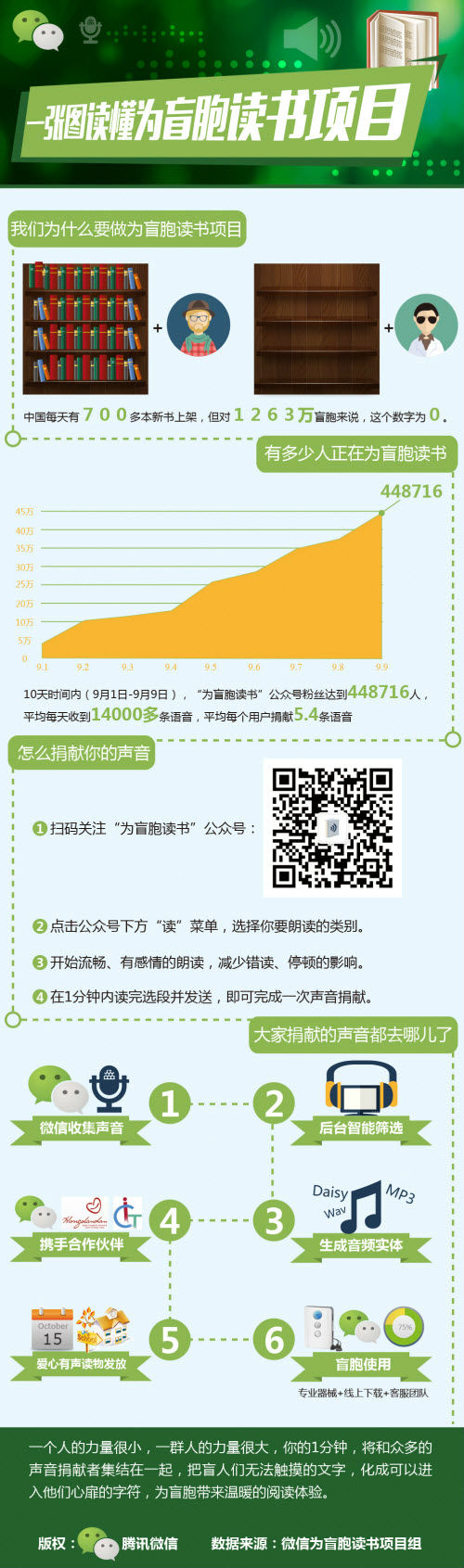 扫描以下二维码,关注“为盲胞读书”微信公众号,一起来捐献你的声音吧!