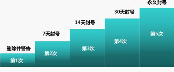 第一次删文并警告、第二次封7天、第三次封14天、第四次封30天、第五次永久封号。