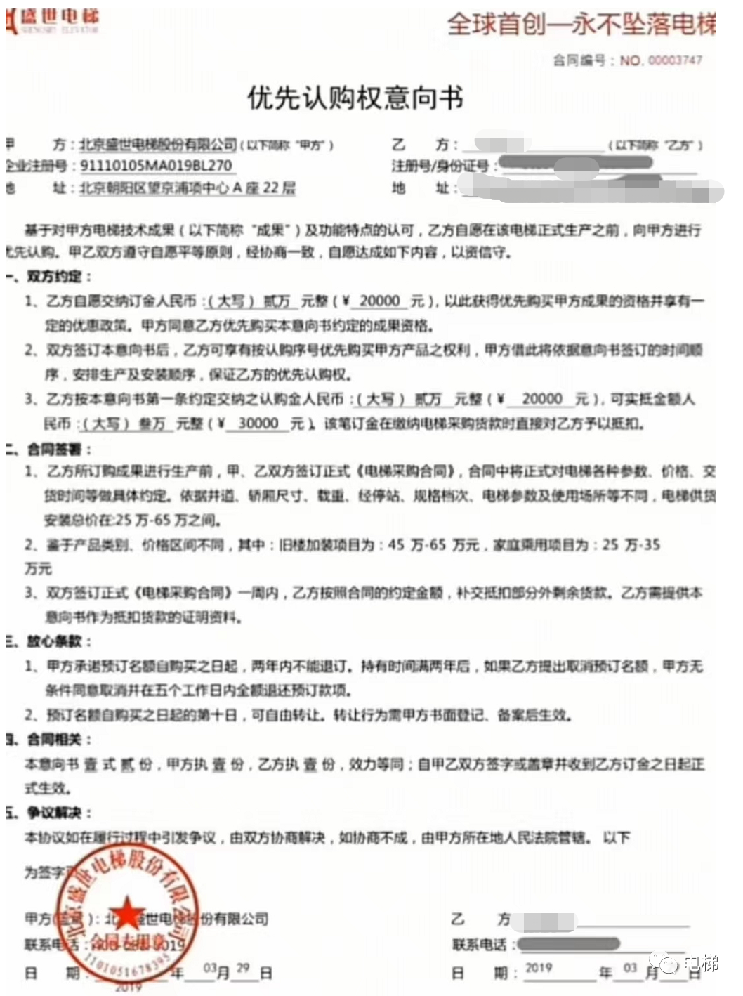以公司名义,以对外预售电梯为名,要求参加者至少出资2万元预定一台盛世电梯编号以获得加入及发展下线会员的资格,按预定金额或下线会员累计预定金额,将会员分成“会员”、“业务组长”(预定或下线累计预定盛世电梯30万元)、“高级业务组长”(2名直接下线会员达到业务组长)、“业务主任”(2名直接下线会员达到高级业务组长)、“高级业务主任”(2名直接下线达到业务主任)、“经理”(2名直接下线达到高级业务主任)等层级,会员推荐下线预定一台盛世电梯可获得10%的直接推荐奖励,业务组长至经理级还可获得其下线推荐的会员预定款的4%的间接推荐奖励;对会员级别规定了“可超越性”——下线会员与其上线平级时,则上线不能从该下线获得间接推荐奖励,以激励参加者发展下线会员。 按照这样的描述,会员招一个人预定一台电梯,交纳2万元的预定金,会员获得10%也就是2000元的奖励,业务组长、高级业务组长、业务主任、高级业务主任、经理每人获得4%的奖励,每人800元,5人共计4000元。这样2万元的预定金共支付出去6000奖励,占预定金的30%。 直接销售有10%的奖励,一台电梯2万的预订单,推荐人可以得到2千元的销售佣金。为鼓励团队销售,公司还分配了管理佣金,当你的业绩达到了30万预订单时,新增部分拿4%;而总数达到100万时,可拿100万以外新增部分的4%。对于高级主任,下面有两个100万,这个时候可以拿到新增业绩的4%。再往上当你的业绩越来越好,下面有两个高级主任就可以拿新增业绩的4%。高级经理是产生两个业务经理的时候就拿新增业绩的4%,以此类推。当被推广预购者业绩超过推广预购者本人的业绩时,公司不再给予被推广预购者再推广的新增业绩4%的间接奖励;所有的直接奖励和间接奖励总额不超过每单笔预订金额2万元的30%。 会员预定电梯台量是不限定的,比如你可以预定15台,这样你就直接从会员升级到业务组长。有一太原的男子,在某视频平台发布的消息称他就预定了20台电梯。 我们看下盛世电梯这个优先认购权意向书,会员交纳的这2万的订金,购买电梯可以抵扣3万元,这个钱2年之内不能退,满2年之后如果不想预定电梯了,会员提出取消预定名额,盛世电梯则把钱在五个工作日之内退给对方。