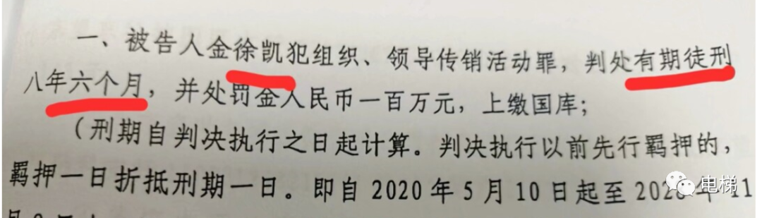 原来我们发过《罕见!电梯厂老板一审被判刑8年6个月!二审维持原判!》,讲的是: 深圳盛世电梯股份有限公司、北京盛世电梯股份有限公司、四川盛世电梯科技有限公司三家公司的实际控制人金徐凯在2021年9月16日被湖南省邵阳市大祥区人民法院以领导传销活动罪判处有期徒刑8年6个月,并处罚金100万元。 时间为2020年5月10日到2028年11月9日。因为对金徐凯的羁押时间是从2020年5月10日开始的。