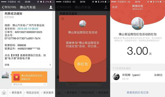 购票成功后,用户即有机会获得客运站送出的微信红包。 送红包活动从2月13日就开始了,将一直持续到3月15日。如果春节回家没有领取,返程请一定不要错过了这份心意!